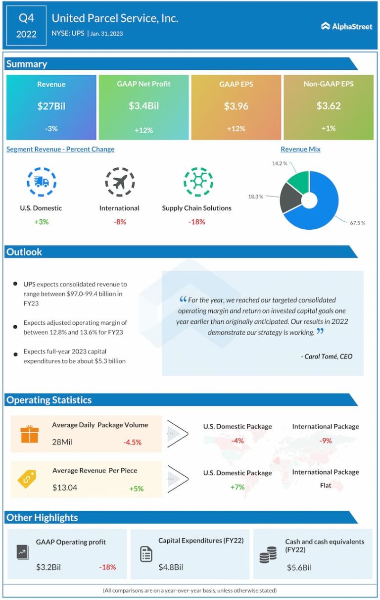 United Parcel Service (NYSE: UPS) reported fourth quarter 2022 earnings results today. Consolidated revenues decreased 2.7% year-over-year to...