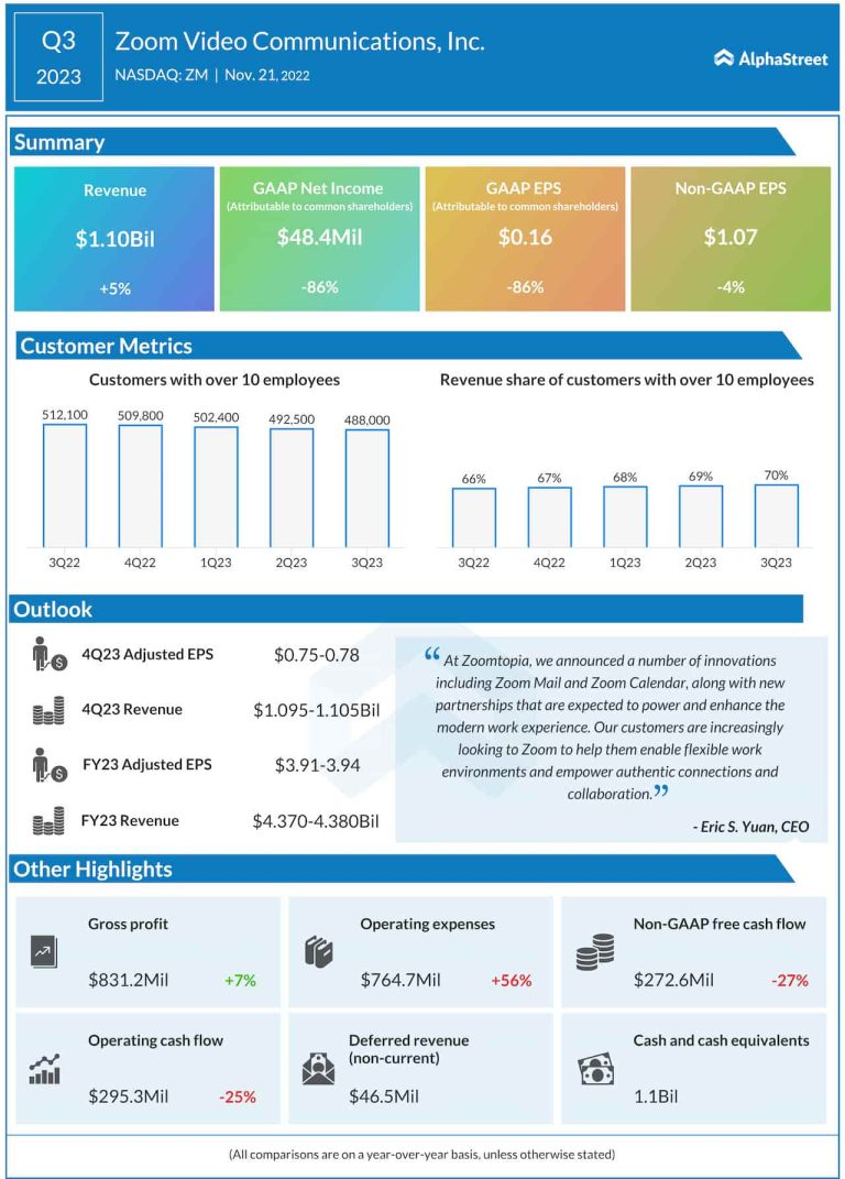 Zoom Video Communications (NASDAQ: ZM) reported lower earnings and higher revenues for the third quarter of 2023. Earnings...