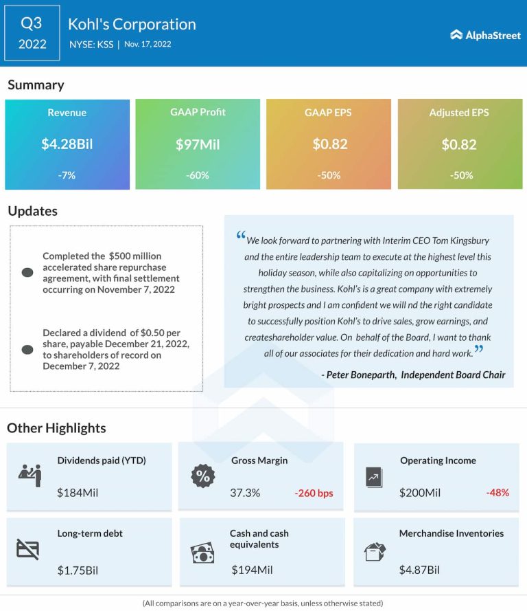 Department store chain Kohl’s Corp. (NYSE: KSS) on Thursday reported a decline in third-quarter adjusted earnings and revenues....