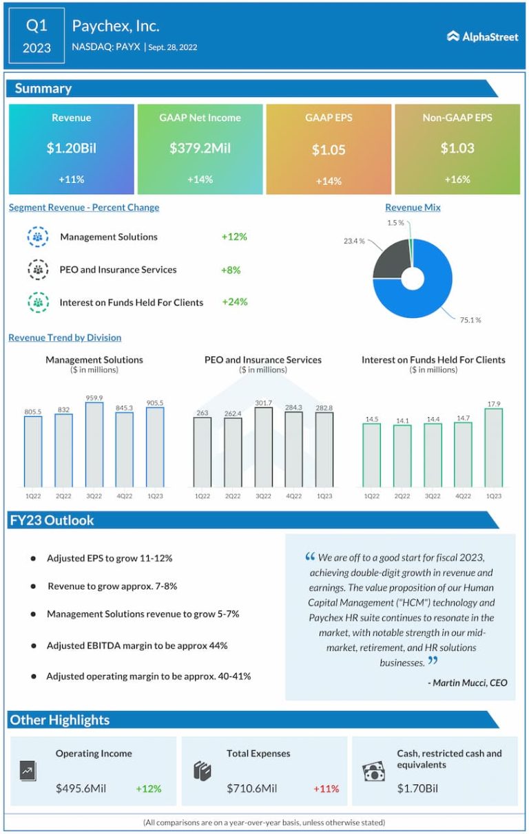 Paychex Inc. (NASDAQ: PAYX) reported first quarter 2023 earnings results today. Total revenue rose 11% year-over-year to $1.20...