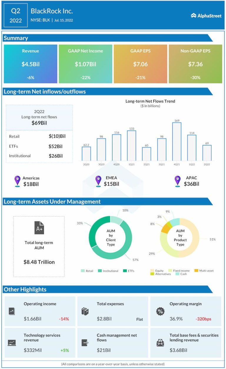 BlackRock, Inc. (NYSE: BLK) reported second quarter 2022 earnings results today. Total revenue decreased 6% year-over-year to $4.5...