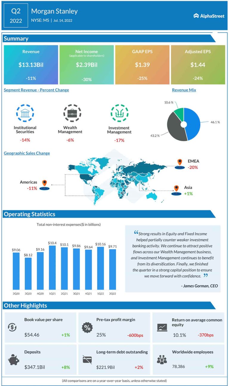 Banking giant Morgan Stanley (NYSE: MS) on Thursday reported lower earnings and revenues for the second quarter of...