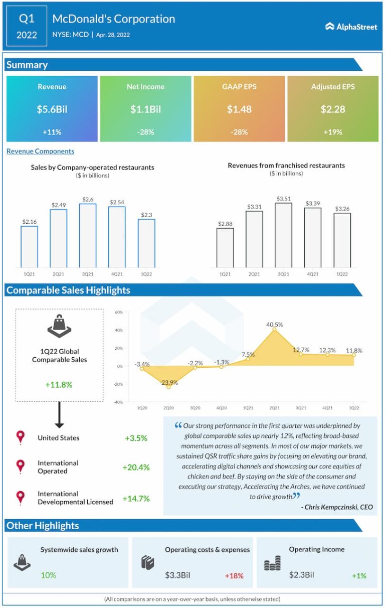 McDonald’s Corporation (NYSE: MCD) reported first quarter 2022 earnings results today. Consolidated revenues increased 11% year-over-year to $5.6...