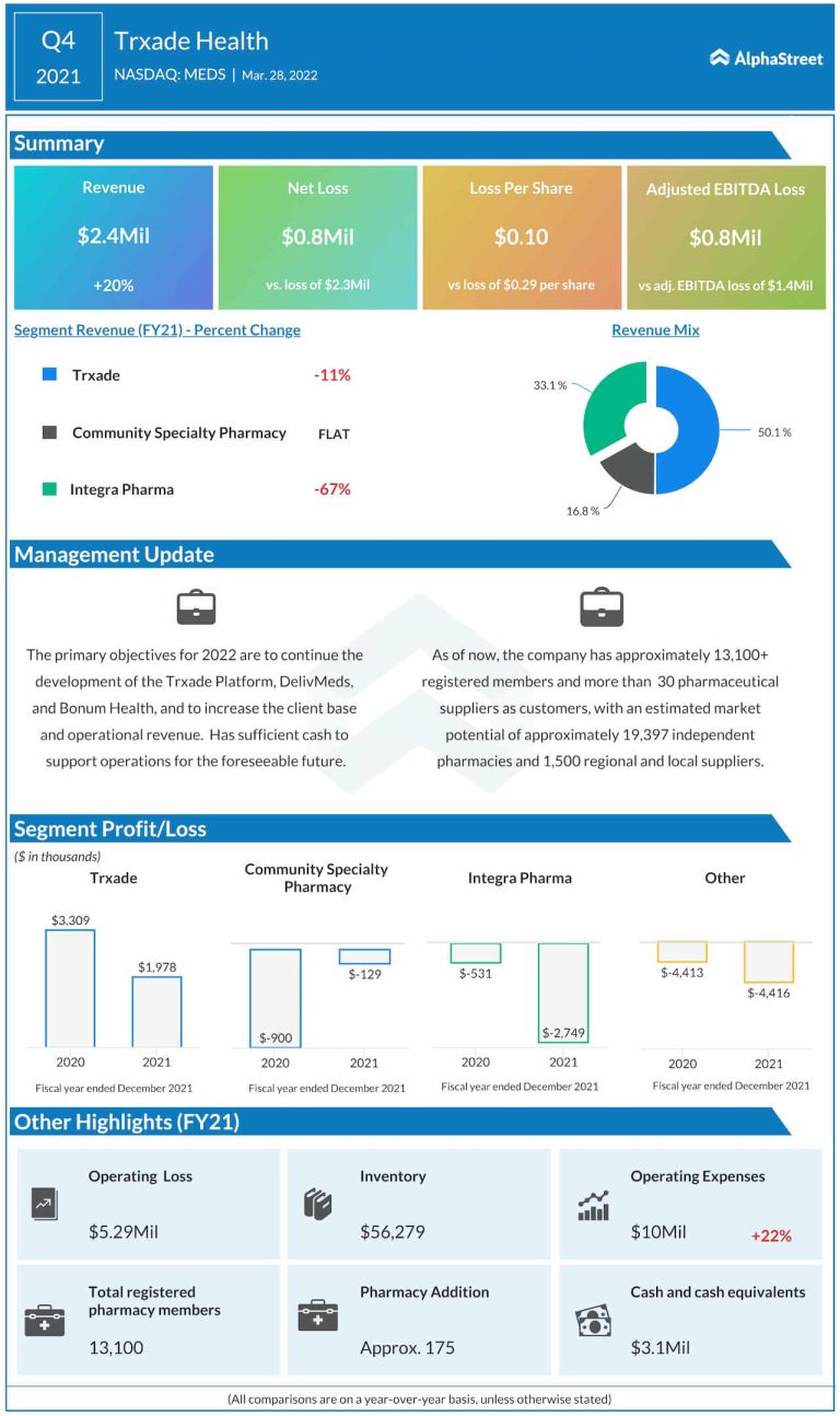 Trxade Health Inc (NASDAQ: MEDS) Monday reported a narrower net loss for the fourth quarter of 2021 as the...