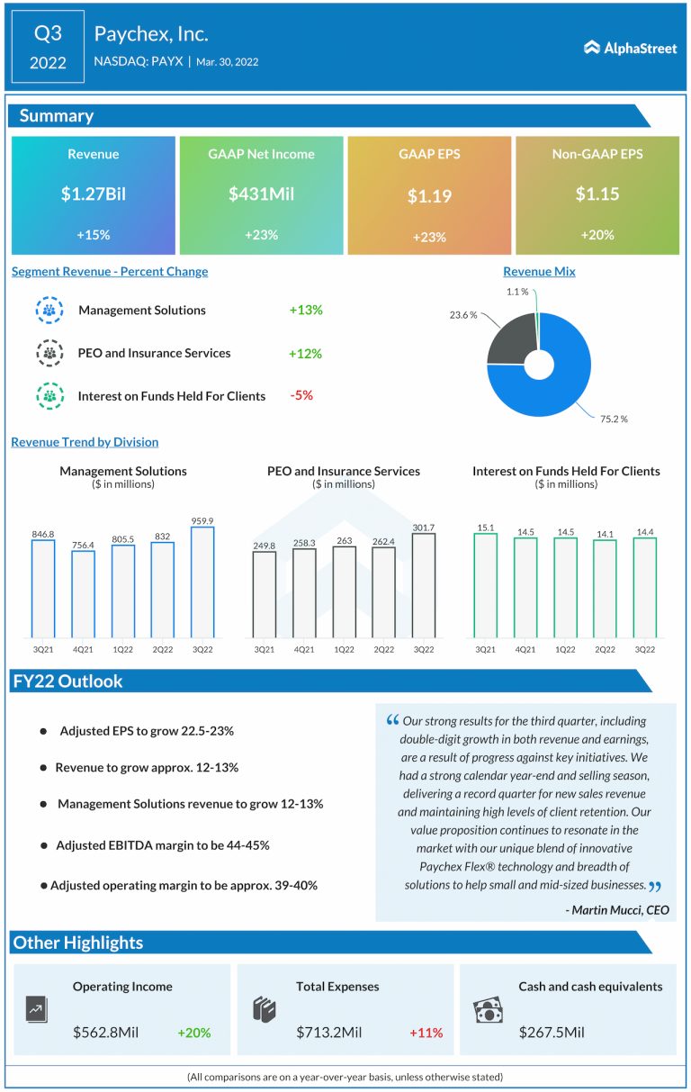 Paychex Inc. (NASDAQ: PAYX) reported third-quarter 2022 earnings results today. Total revenue increased 15% year-over-year to $1.27 billion....