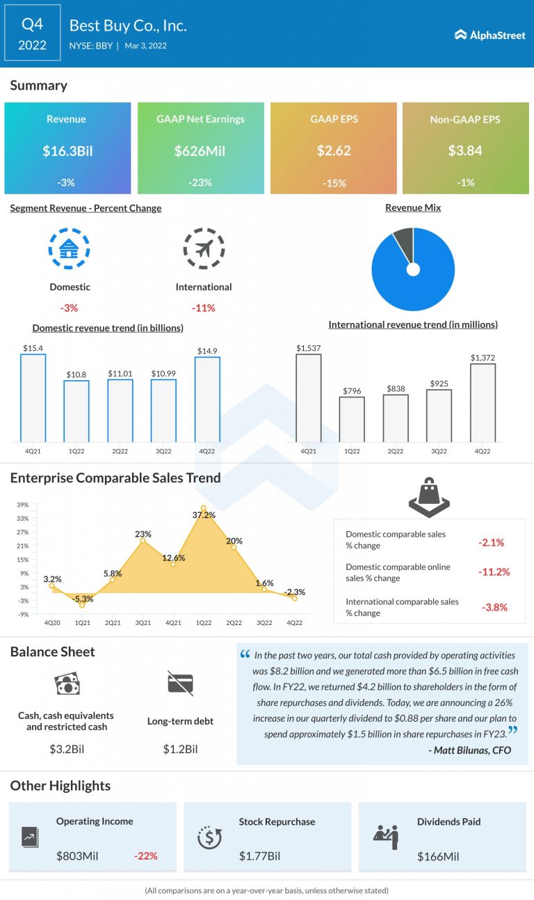 Best Buy Co. Inc. (NYSE: BBY) reported the fourth quarter of 2022 earnings results today. Enterprise revenues decreased...