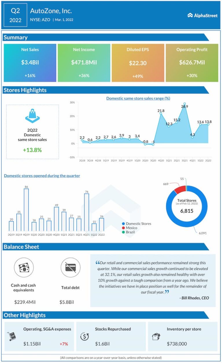 AutoZone Inc. (NYSE: AZO) reported second quarter 2022 earnings results today. Net sales increased 15.8% year-over-year to $3.4...