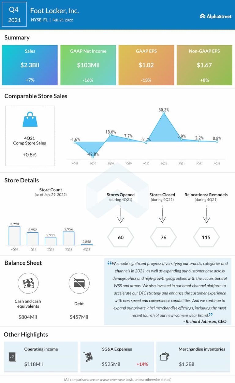 Foot Locker, Inc. (NYSE: FL) reported fourth quarter 2021 earnings results today. Total sales increased 6.9% year-over-year to $2.3...