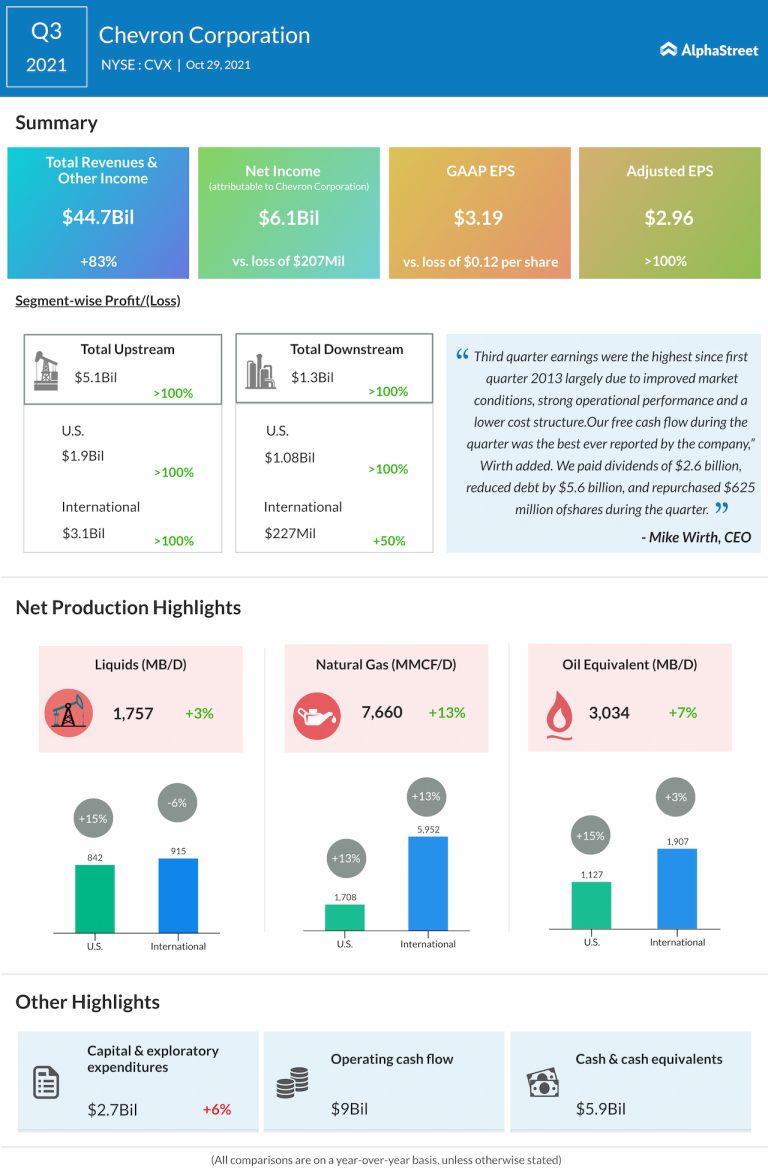 Chevron Corporation (NYSE: CVX) reported third-quarter 2021 earnings results today. Total revenues amounted to $44.7 billion compared to...