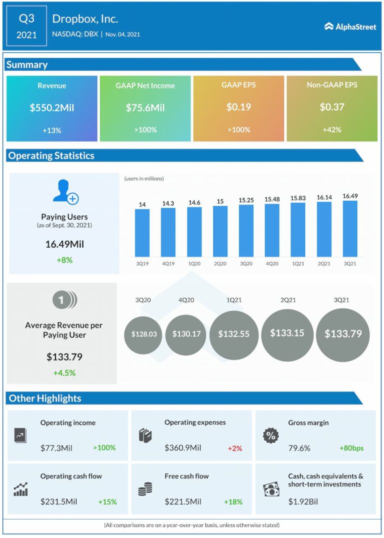 Dropbox Inc. (NASDAQ: DBX) reported third quarter 2021 earnings results today. Total revenue grew 13% year-over-year to $550.2...