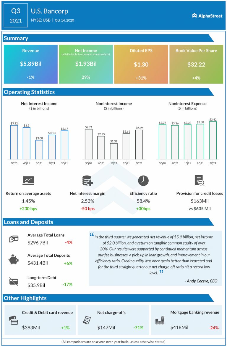 US Bancorp (NYSE: USB) reported earnings results for the third-quarter of 2021. Net revenue decreased 1% year-over-year to...