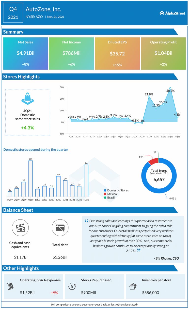 AutoZone, Inc. (NYSE: AZO) today reported its fourth-quarter financial results for the period ended August 28 , 2021....