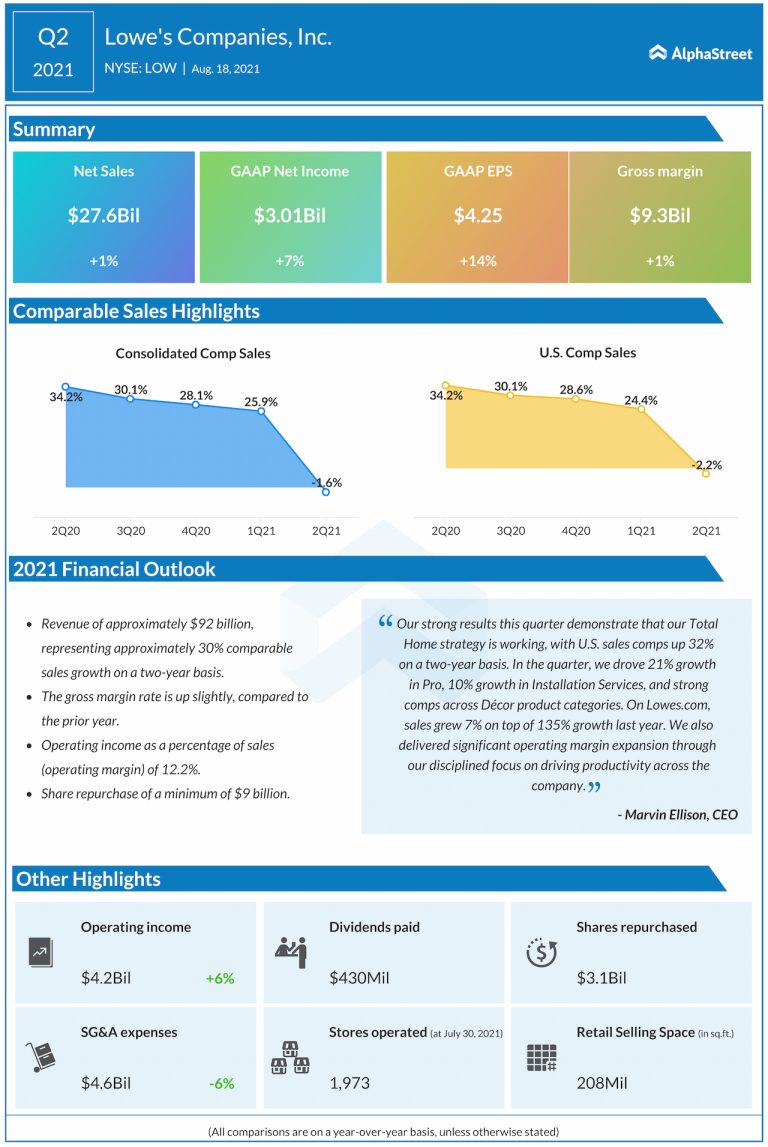 Lowe’s Companies, Inc. (NYSE: LOW) reported second-quarter 2021 financial results before the regular market hours on Wednesday. The...