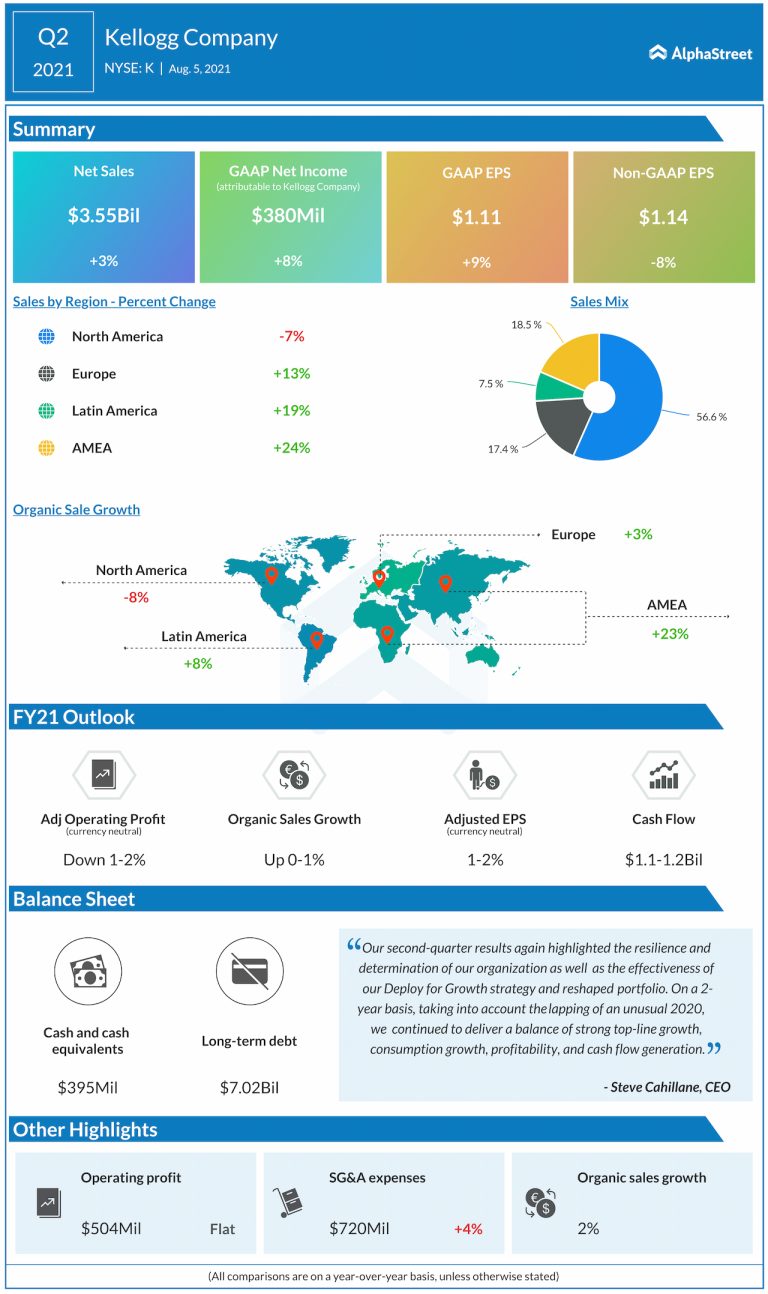 Kellogg (NYSE: K) reported its second-quarter 2021 earnings before the opening bell today. The net sales increased by 3% to...
