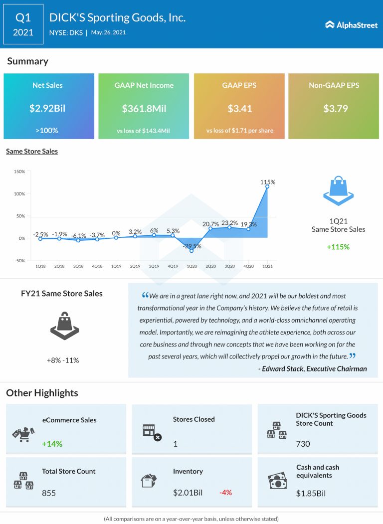 Dick’s Sporting Goods, Inc. (NYSE: DKS) reported first-quarter 2021 earnings results today. Net sales increased 119% to $2.92...