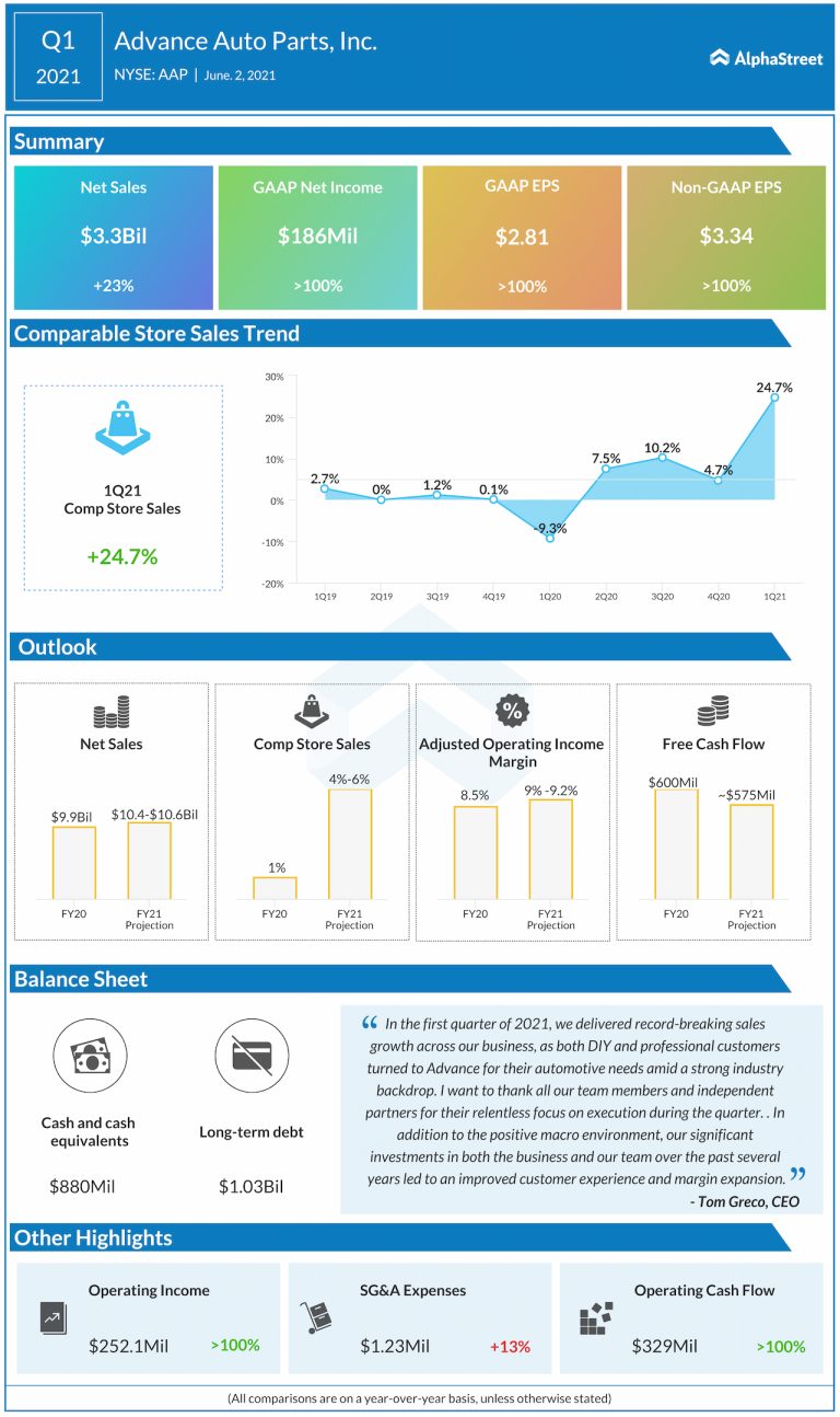 Advance Auto Parts, Inc. (NYSE: AAP) reported first-quarter 2021 earnings results today. Net sales increased 23.4% to $3.3...