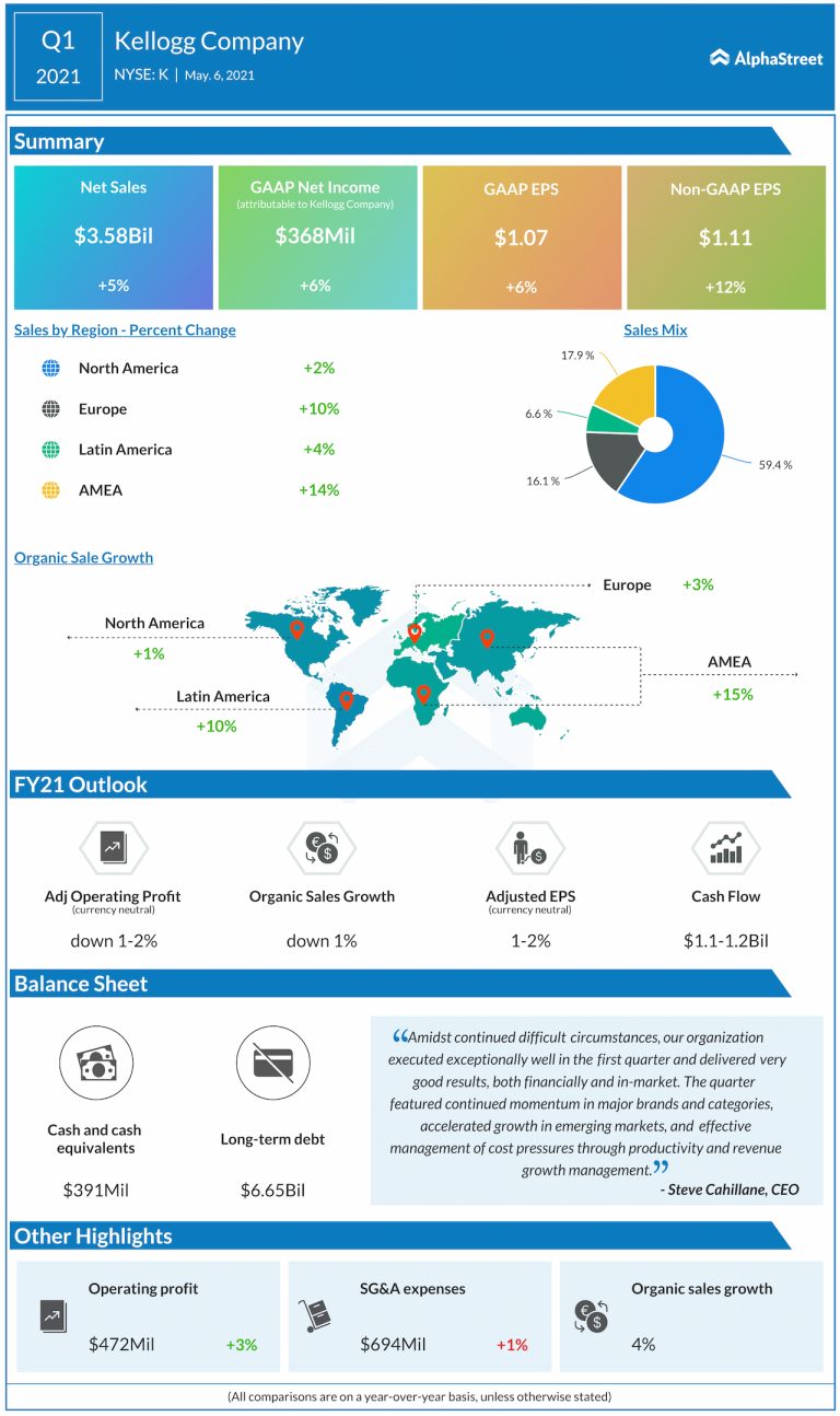 Kellogg (NYSE: K) reported its first-quarter 2021 earnings before the opening bell today. The net sales increased by...