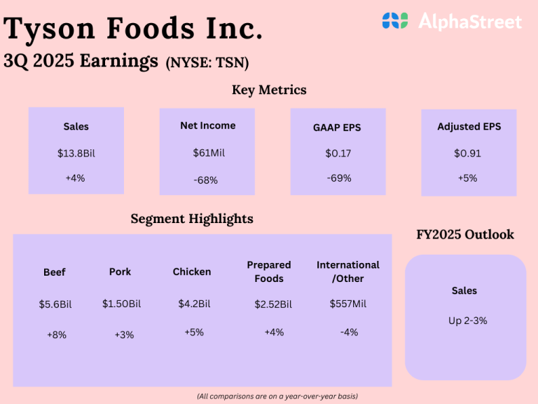 Tyson Foods, Inc. (NYSE: TSN) reported its third quarter 2025 earnings results today. Sales of $13.8 billion were...