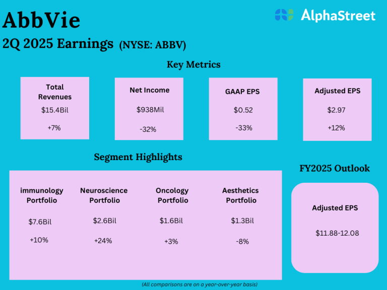 AbbVie (NYSE: ABBV) reported its second quarter 2025 earnings results today. Worldwide net revenues were $15.4 billion, up...