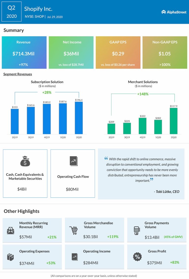 E-commerce firm Shopify Inc. (NYSE: SHOP) reported second quarter 2020 earnings results today. Total revenues increased 97% to...