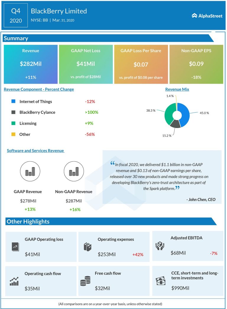 BlackBerry Limited (NYSE: BB) reported fourth-quarter 2020 earnings results on Tuesday, March 31, after the market close. BB...