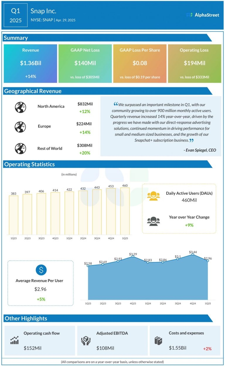 Snap Inc. (NYSE: SNAP) reported revenues of $1.36 billion for the first quarter of 2025, up 14% year-over-year....
