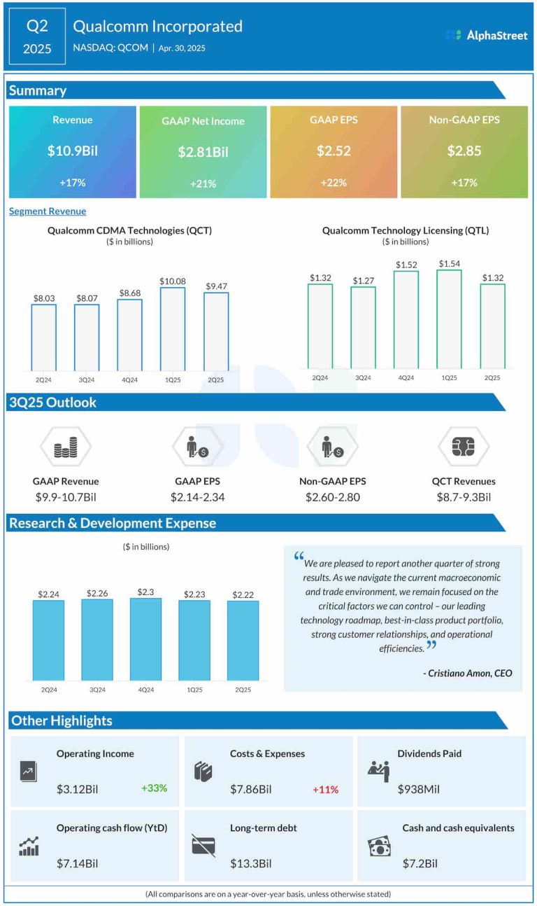Qualcomm, Inc. (NASDAQ: QCOM), a leading manufacturer and supplier of digital wireless communication products, Wednesday reported higher revenues...