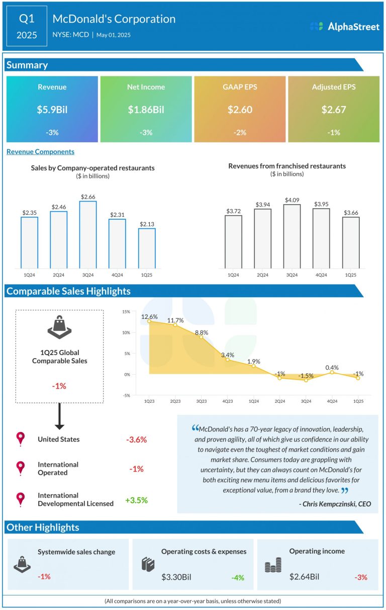 McDonald’s Corporation (NYSE: MCD) reported its first quarter 2025 earnings results today. Consolidated revenues decreased 3% year-over-year, or...