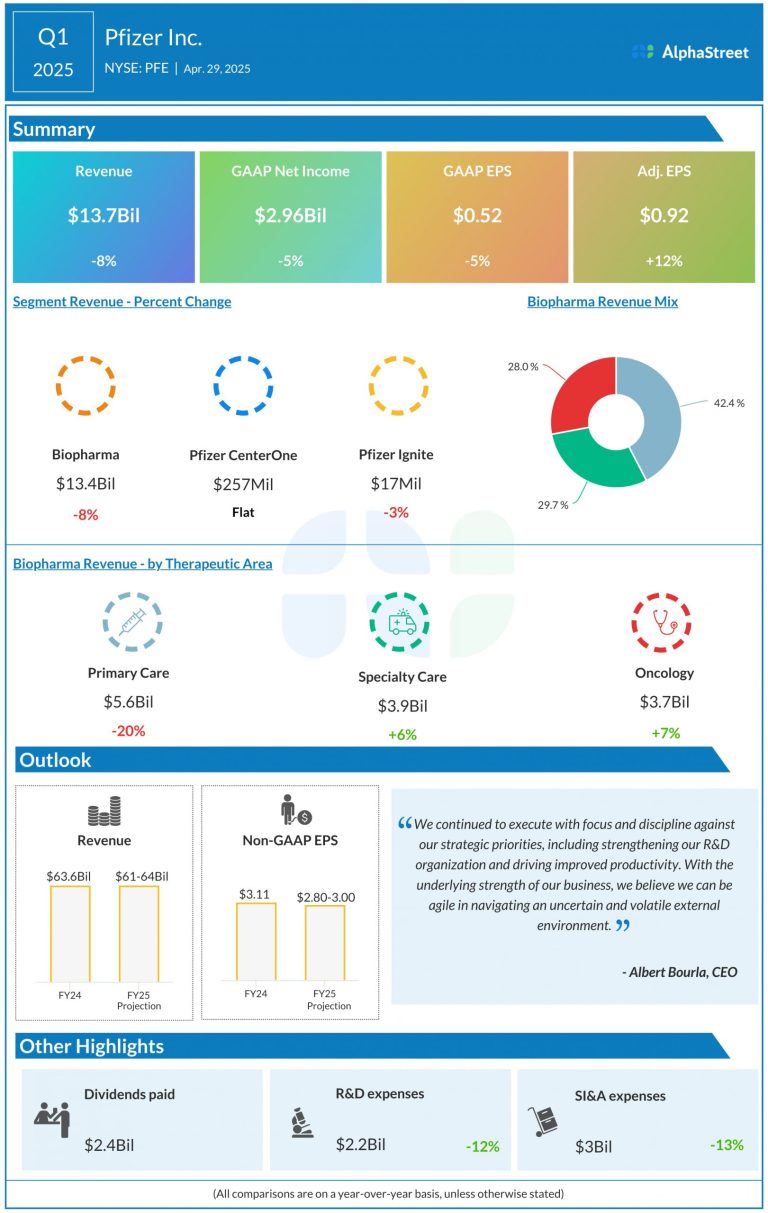 Pfizer Inc. (NYSE: PFE) reported its first quarter 2025 earnings results today. Revenues decreased 8% year-over-year to $13.7...