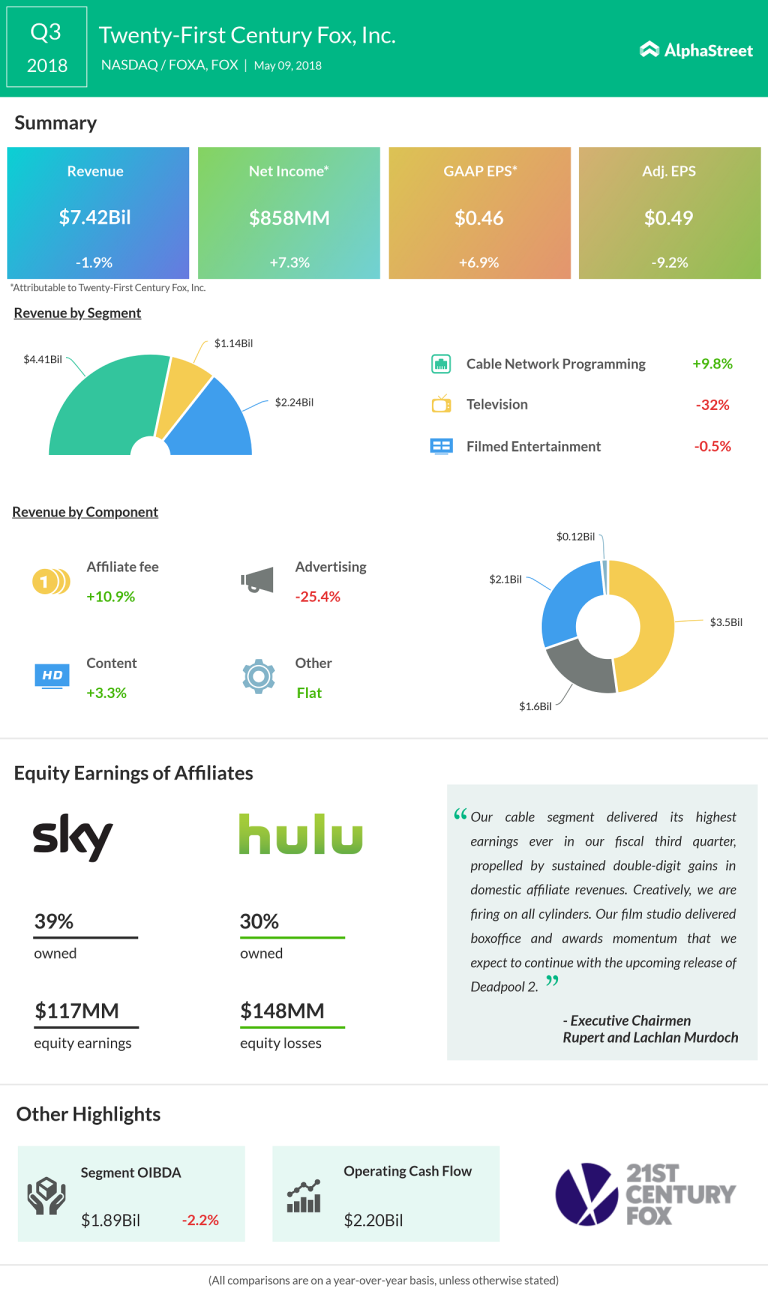 Twenty-First Century Fox (FOXA) reported a 7.4% rise in earnings for the third quarter, helped by sustained double-digit...