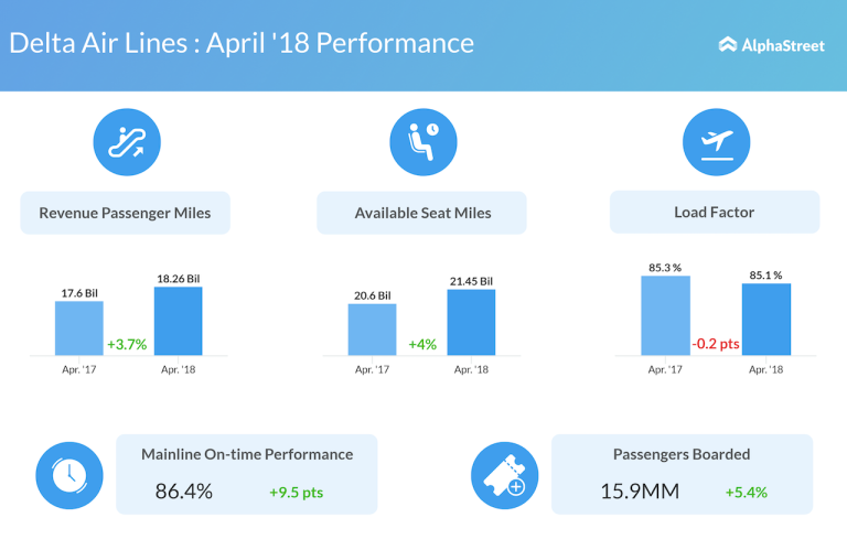 Delta Air Lines (DAL) reported some impressive growth in both traffic and capacity for the month of April....