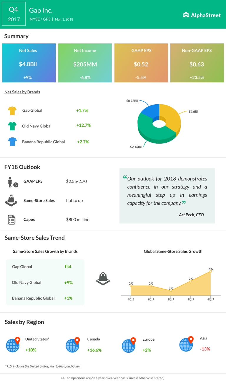 Gap Inc. reported an 8% increase in total sales for its fourth quarter of 2017 while its same-store...