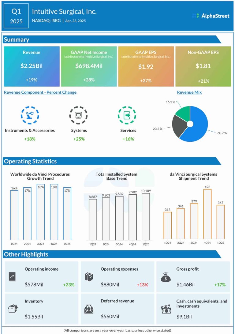 Healthcare technology company Intuitive Surgical Inc. (NASDAQ: ISRG) Wednesday reported a sharp increase in revenue and adjusted earnings...