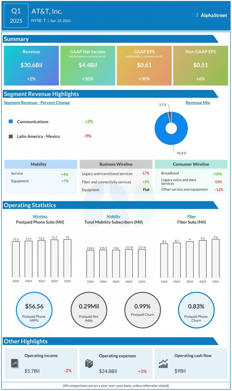 AT&T (NYSE: T) reported its first quarter 2025 earnings results today. Revenues were $30.6 billion, up 2% year-over-year,...