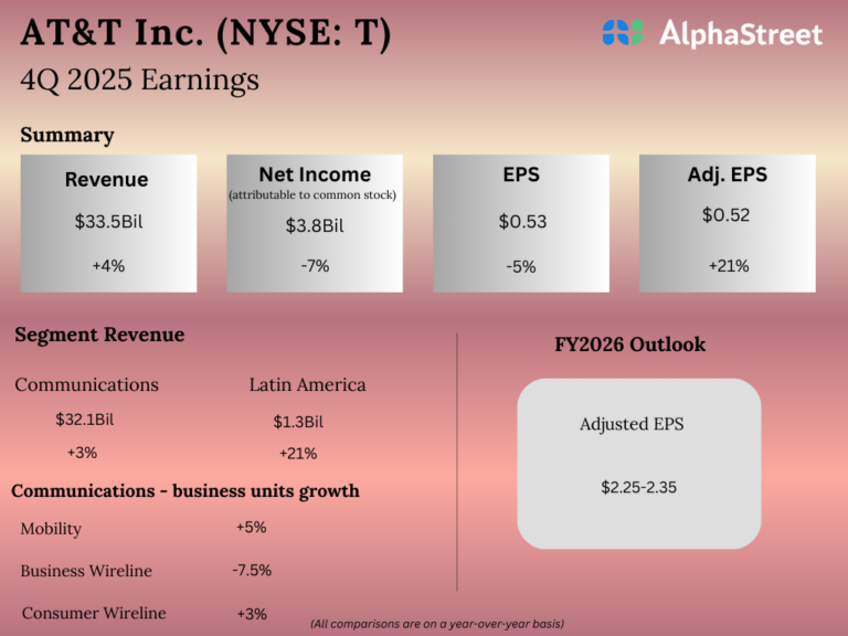 AT&T Inc. (NYSE: T) reported its fourth quarter 2025 earnings results today. Revenues increased 3.6% year-over-year to $33.5...