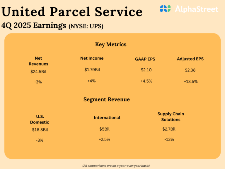 UPS (NYSE: UPS) reported its fourth quarter 2025 earnings results today. Total revenue decreased 3.2% year-over-year to $24.5...