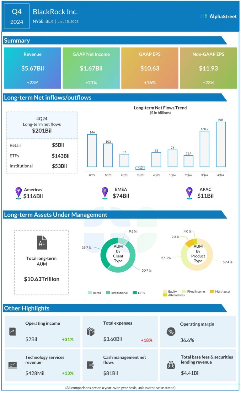 BlackRock, Inc. (NYSE: BLK) reported its fourth quarter 2024 earnings results today. Revenues increased 23% year-over-year to $5.67...