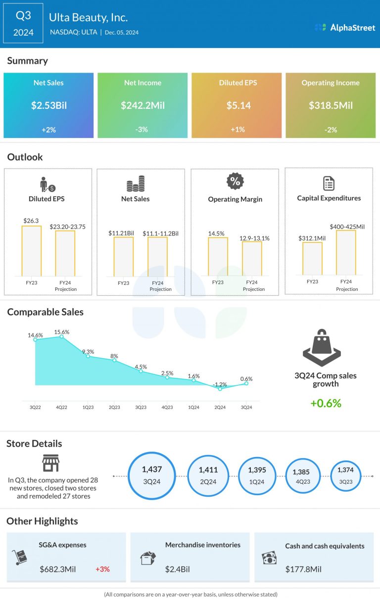 Ulta Beauty, Inc. (NASDAQ: ULTA) reported net sales of $2.53 billion for the third quarter of 2024, up...