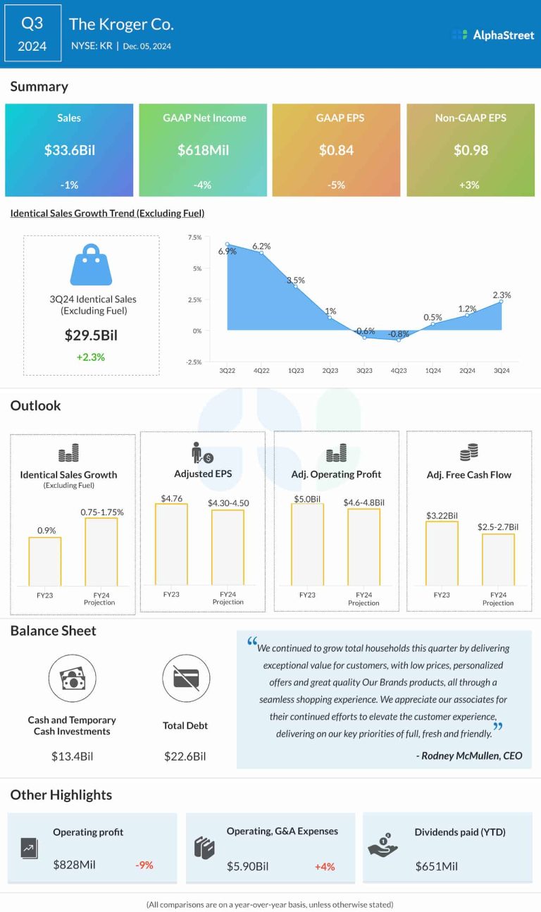 The Kroger Co. (NYSE: KR) reported an increase in adjusted earnings for the third quarter of 2024, while the...