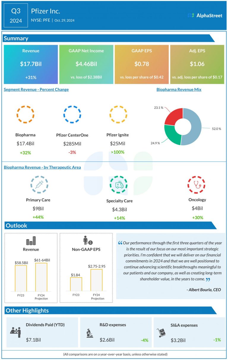 Pfizer Inc. (NYSE: PFE) reported its third quarter 2024 earnings results today. Revenues increased 31% year-over-year to $17.7...