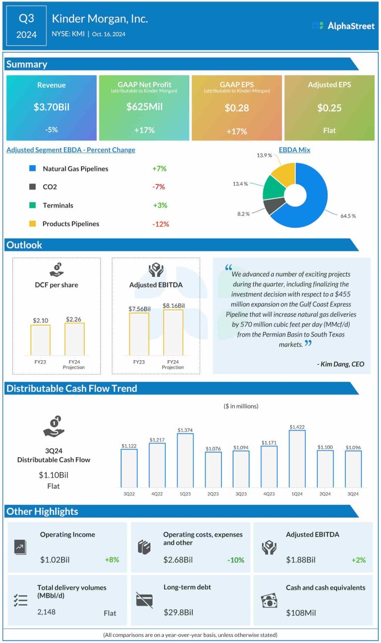 Energy infrastructure company Kinder Morgan, Inc. (NYSE: KMI) on Wednesday reported financial results for the third quarter of...