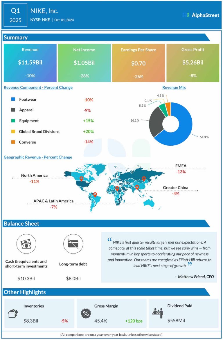 Nike, Inc. (NYSE: NKE) on Tuesday reported a decrease in sales and profit for the first quarter of...