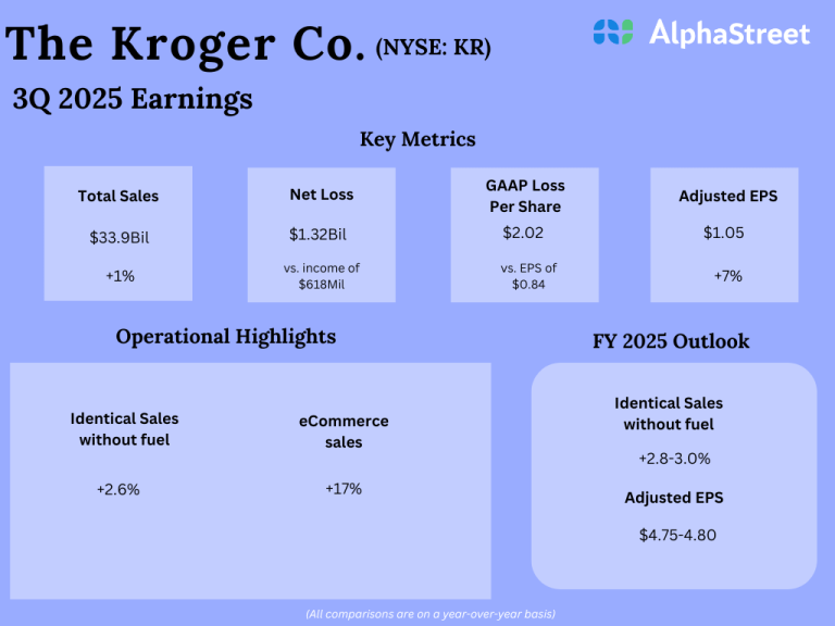 The Kroger Co. (NYSE: KR) reported its third quarter 2025 earnings results today. Total company sales rose to...