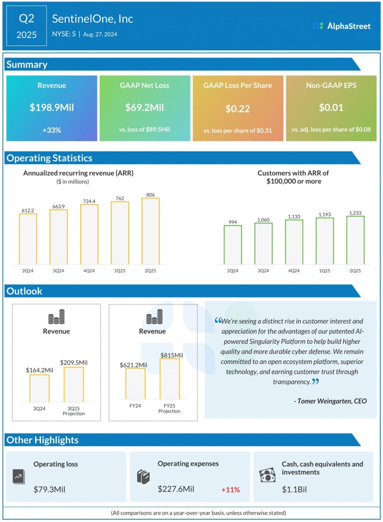 SentinelOne, Inc. (NYSE: S) reported total revenue of $198.9 million for the second quarter of 2025, up 33%...
