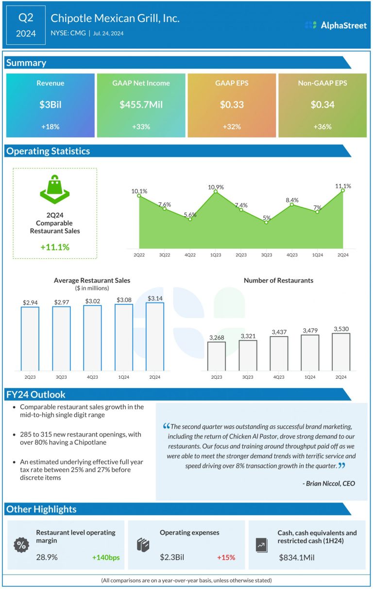 Chipotle Mexican Grill, Inc. (NYSE: CMG) reported total revenues of $3 billion for the second quarter of 2024,...