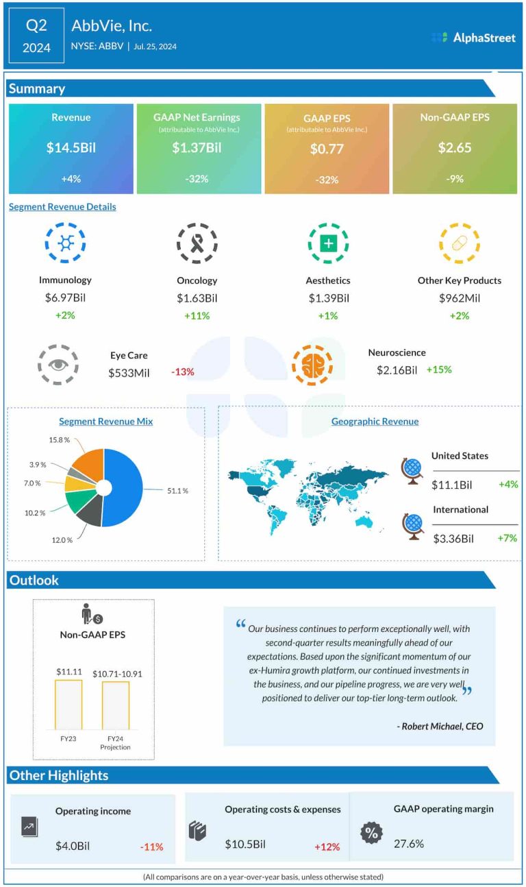 Specialty biopharmaceutical company AbbVie, Inc. (NYSE: ABBV) Thursday announced second-quarter 2024 financial results, reporting a decline in adjusted...