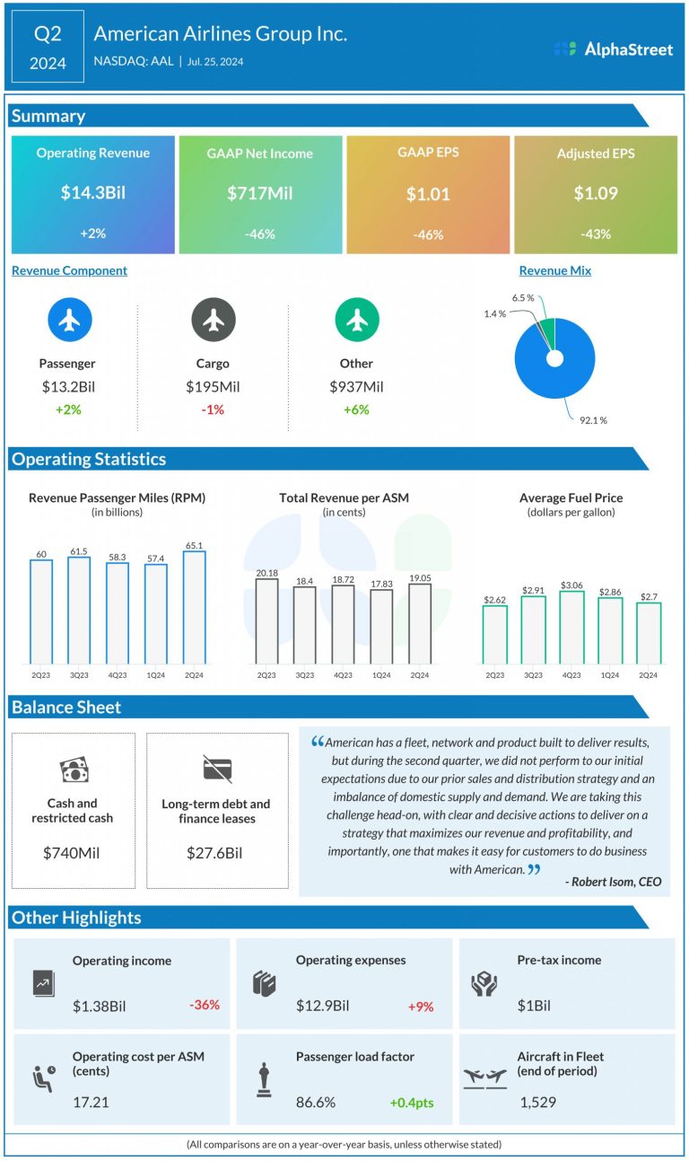 American Airlines Group Inc. (NASDAQ: AAL) reported its second quarter 2024 earnings results today. Total operating revenues increased 2%...