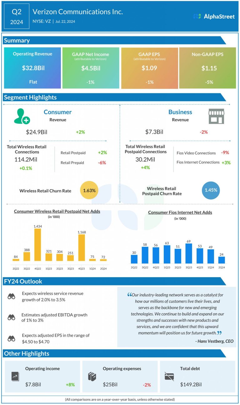 Verizon Communications Inc. (NYSE: VZ) reported its second quarter 2024 earnings results today. Total operating revenue was $32.8...