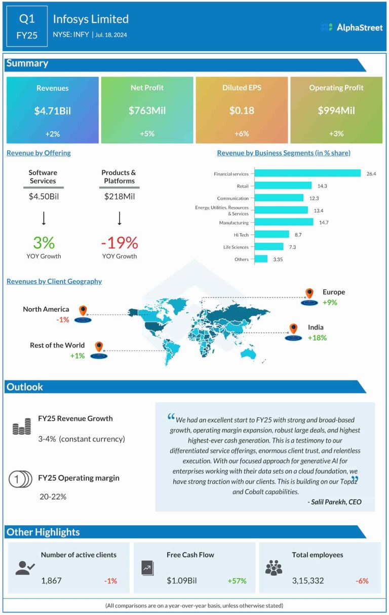 Software company Infosys (NYSE: INFY) on Thursday reported a modest increase in revenues and profit for the first...