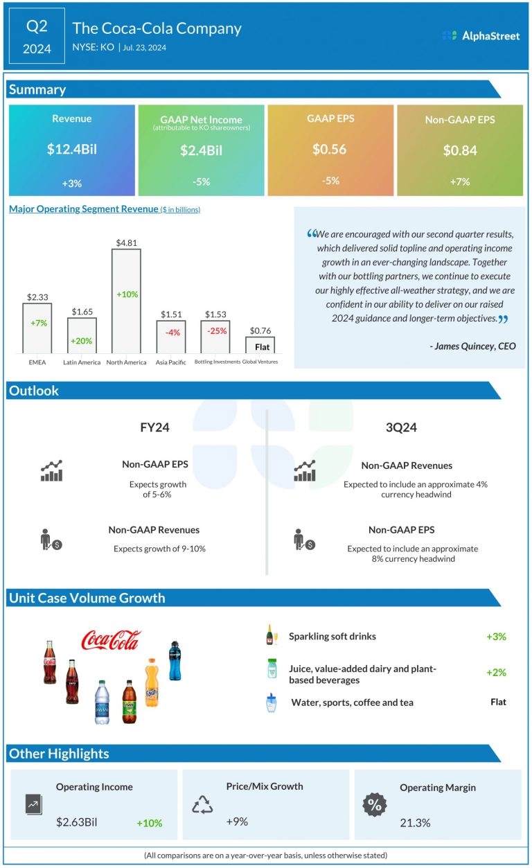 The Coca-Cola Company (NYSE: KO) reported its second quarter 2024 earnings results today. Net revenues grew 3% to...